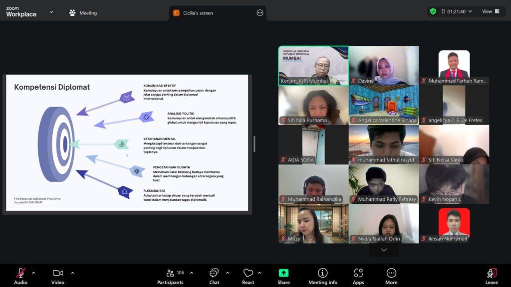 Dalam kesempatan ini, narasumber utama dari KJRI Mumbai, Bapak Edy Wardoyo, menyampaikan materi dengan tema “Pengalaman Diplomasi Indonesia: Tugas Diplomat di Luar Negeri”. Ia menjelaskan bahwa diplomasi memainkan peran krusial dalam menjaga hubungan antarnegara, yang berdampak pada perkembangan politik, ekonomi, dan budaya global. “Diplomat di berbagai tingkatan memiliki tanggung jawab yang sesuai dengan pangkat dan wewenangnya, mulai dari menangani hubungan bilateral hingga berperan dalam kerjasama multilateral,” ujarnya.